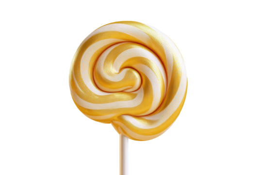 Swirled yellow and white lollipop on stick against white background, cut out