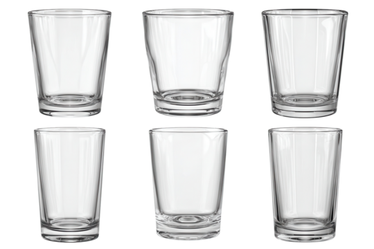 Different shapes of clear glass drinking vessels arranged in two rows on a white background for display purposes