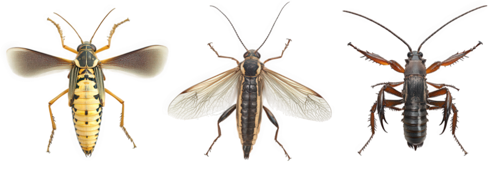 three distinct insects. each showcasing unique physical characteristics the first insect has a yellow and black body. the second is a slender. dark-winged insect. and the third is a robust. dark-color