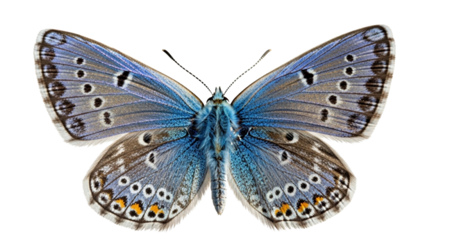 Detailed top-down view of a vibrant blue butterfly with intricate wing patterns and delicate details.