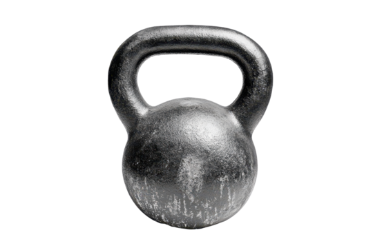 A dark gray cast iron kettlebell, slightly worn, sits centered against a black background.  Its rounded body and arched handle are clearly visible