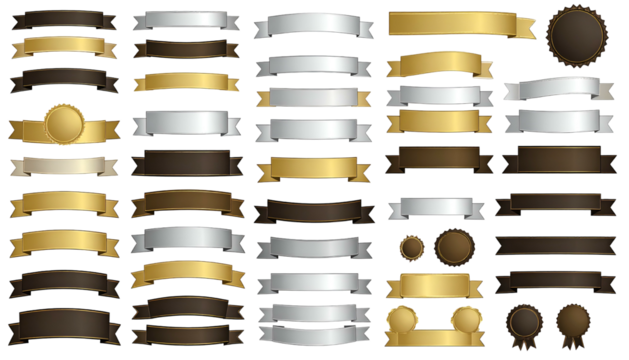 A collection of various horizontal ribbons and circular badges in gold, silver, and brown hues