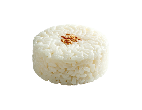 A cylindrical mound of cooked white grains topped with toasted seeds, isolated