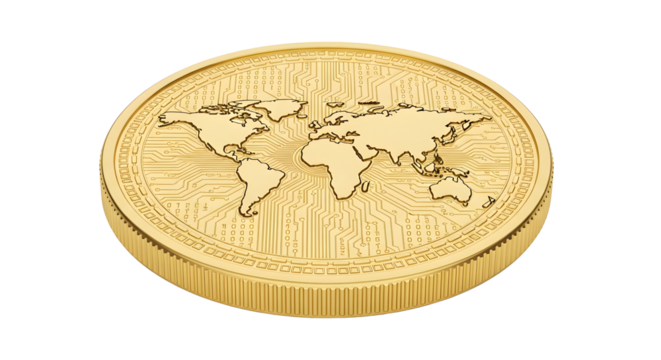 Gold coin with world map engraving isolated on transparent background isolated background