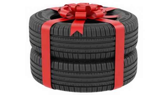 Two car tires stacked and tied with red gift ribbon and bow isolated on transparent background