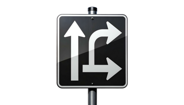 Black and white road sign indicating traffic directions on a dark background