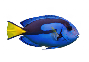 Close up of a vibrant blue reef dwelling fish with a bright yellow tail on a dark setting view on transparent background