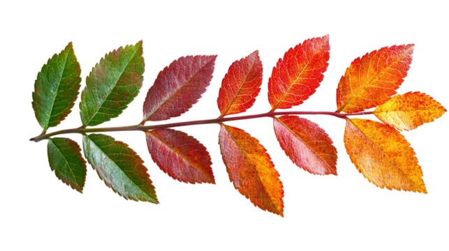 Red and green rowan leafs isolated on transparent background - autumn foliage clipart.