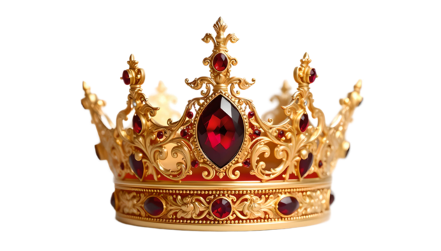 A stunning crown of gold and vibrant red gemstones, exuding elegance and royal luxury, designed with intricate details and unmatched craftsmanship in vivid focus