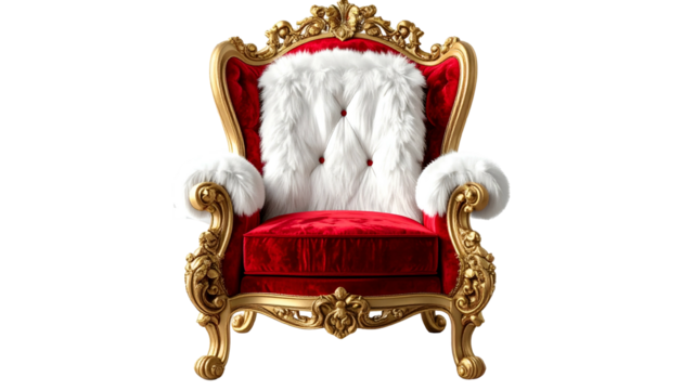 Ornate golden chair with red velvet and white fur accents, fit for royalty