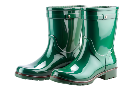 Green rubber boots with mud-covered surface, resting against clean background, highlighting rugged work-ready footwear