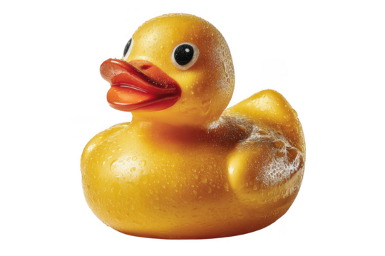 A yellow rubber duck with water droplets on its surface, featuring a bright orange beak and big round eyes.