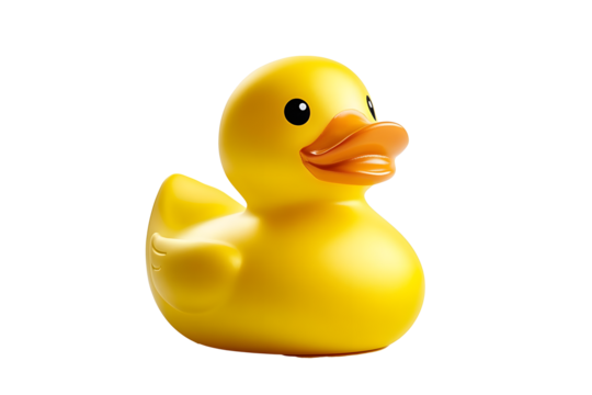 A classic yellow rubber duck toy on a white isolated background, perfect for bath time fun and kids' play.