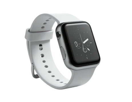 Modern smartwatch with a white strap displaying a minimal clock face, angled