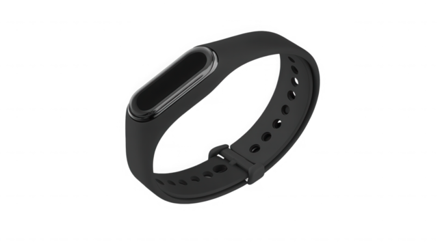 Male hand holding black round smartwatch with rubber strap isolated on transparent background