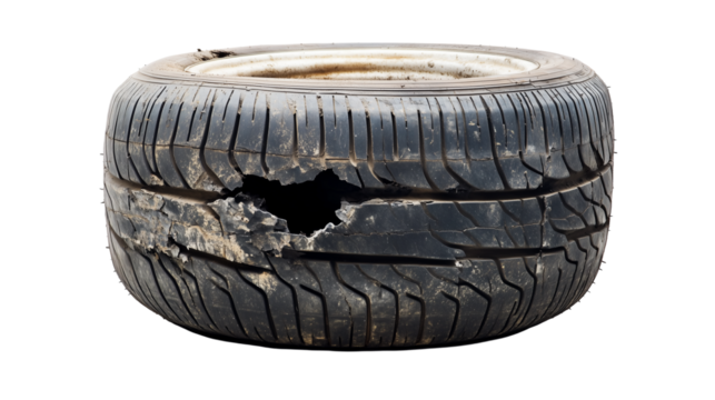 Damaged car tire with visible wear and puncture hole isolated on transparent background