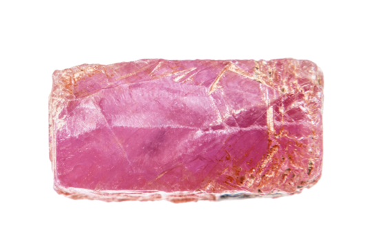 close up of sample of natural stone from geological collection - unpolished pink ruby crystal isolated on white background from Myanmar