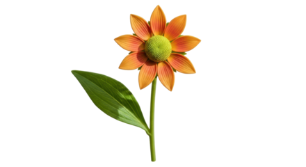 Isolated orange rudbeckia flower with green center and a single leaf against neutral backdrop