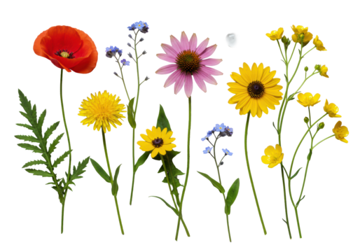 A pristine macrophotography studio shot of individual wildflower stems (poppies, dandelions, echinacea) with a dewdrop on a uniform transparent background, high-key lighting, natural beauty and purity