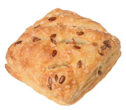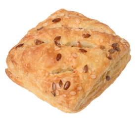 Ruddy puff pastry bun sprinkled with seeds. Isolated background