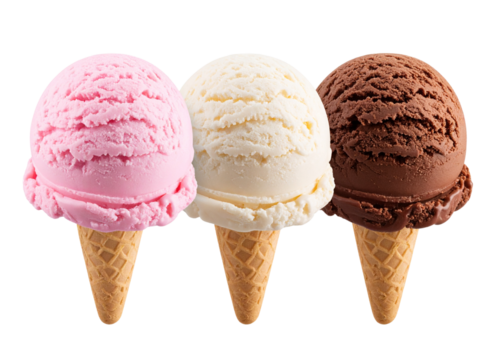 Triple Ice Cream Scoop with Strawberry, Vanilla, and Chocolate Flavors in a Line, Transparent PNG