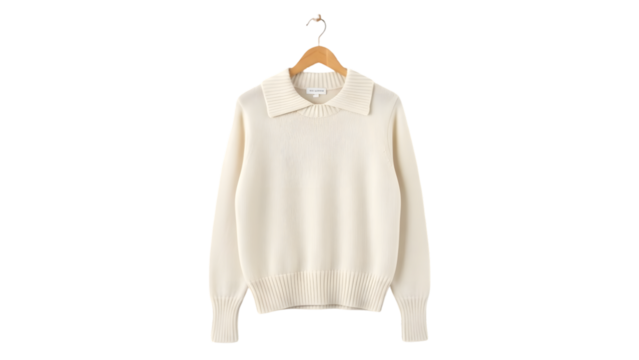 Cream colored long sleeve blouse with ruffled collar and cuffs on a hanger isolated on transparent background