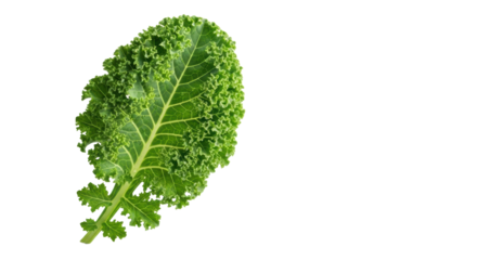 Single pristine curly kale leaf, vibrant bright green, ruffled texture, glistening dew drops, minimalist studio setting, transparent background, right copy space. Concept of natural health and