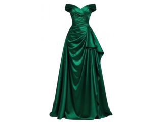 Elegant Green Satin Evening Gown with Ruffles and OffShoulder Design.
