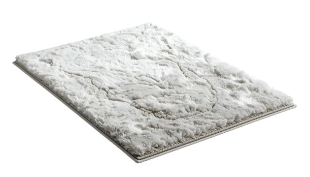 Fluffy white rectangular rug angled. Long fibers create textured surface against a dark background