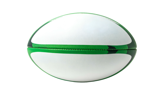 A close-up studio shot of a rugby ball with white panels and green detailing