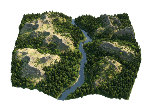Miniature mountainous forest river landscape model showcasing a detailed natural environment with lush green trees, rugged terrain, and a winding blue river.