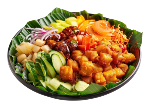 A delicious Singapore-style Rojak dish presented in a wooden bowl, highlighting contr