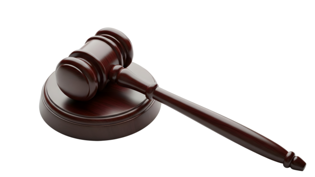 A wooden gavel with a brass band, commonly associated with legal proceedings and authority.