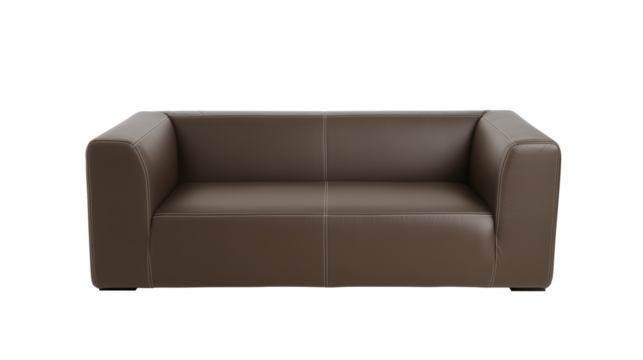 Modern two-seater brown leather sofa with minimalist design on transparent background