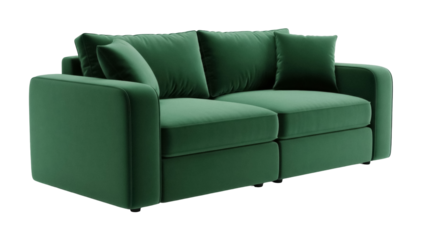 Teal two seater sofa with patterned and solid cushions transparent background cutout png