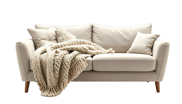 A soft, neutral-toned two-seater sofa with pillows and a cozy knitted throw blanket