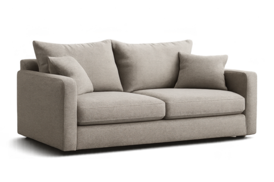 Modern beige two-seater fabric sofa isolated on a transparent background