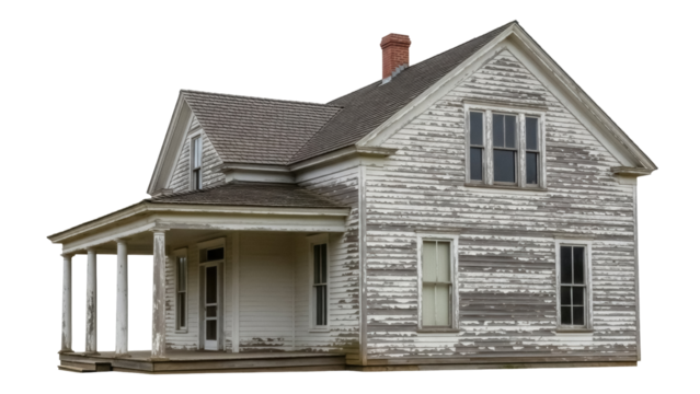 Dilapidated farmhouse PNG isolated on transparent background, old weathered rural house with peeling paint and overgrown yard, vintage architecture