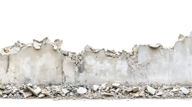 Abandoned concrete building front view full of graffiti over isolated transparent background