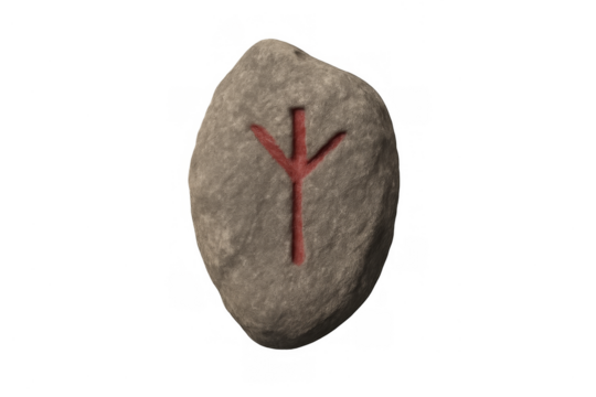 Glowing green algiz rune carved on stone surface, symbolizing spiritual protection and divine connection against transparent backdrop