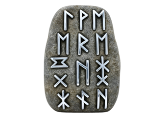Detailed depiction of runic inscriptions etched onto a stone, showcasing intricate silver-toned symbols against a dark background.