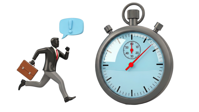 Man with megaphone runs toward large clock woman with megaphone jumps past a giant pencil and abstract orange shape collage art time running jumping communication