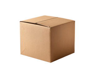 A plain, light brown cardboard box, square-shaped, and closed.  A strip of light beige tape runs vertically down the center