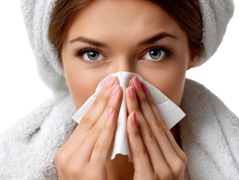 Allergy Sufferer: A woman, wrapped in a fluffy towel, battles a cold, tenderly wiping her nose with a tissue, conveying a relatable moment of discomfort.