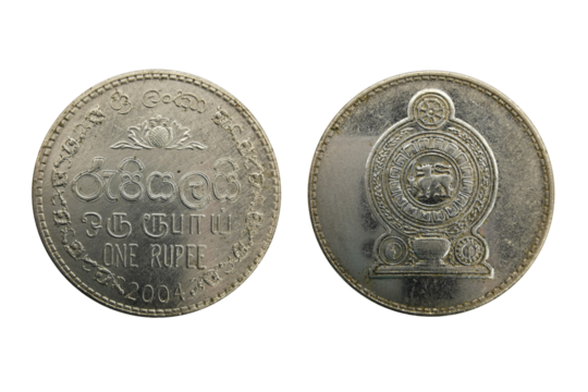 Sri lanka 1 Rupee 2004 coin, made of Nickel-plated steel, Sri Lankan national emblem within a circle of dashes, Traditional Sinhala pineapple motif