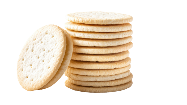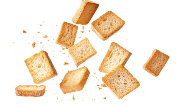 Crispy White Bread Rusks with Crumbs Falling on Transparent Background