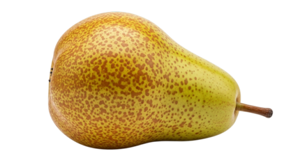 Single Bosc pear with speckled russet skin and stem, isolated on white and transparent background for healthy eating, market, and recipe concepts