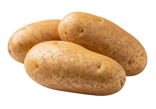 A closeup studio shot of three raw, whole russet potatoes with brown skin and small eyes, isolated on a transparent background