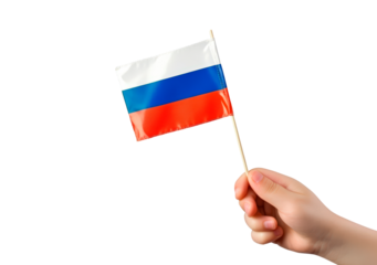 Hand holding small Russian flag on transparent background, PNG