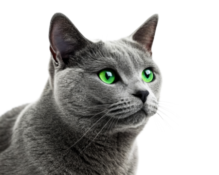 Elegant Russian Blue cat with silver-grey fur and green eyes isolated on transparent PNG background